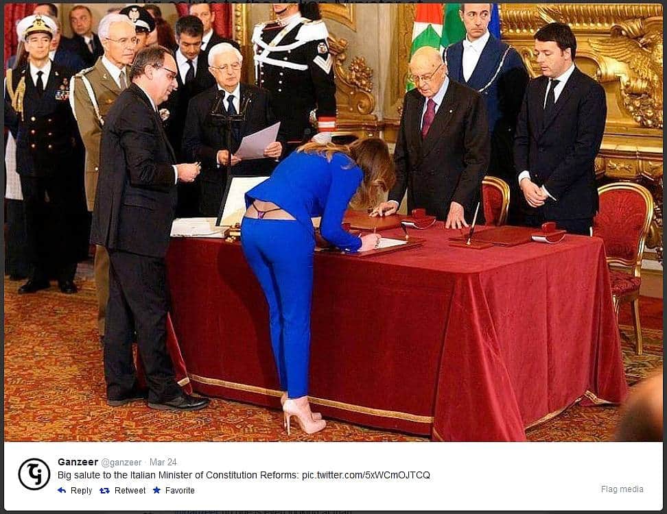 Als am 22. Februar 2014 Italiens neue Regierung vereidigt wurde, gingen vor allem Fotos von Maria Elena Boschi durch die italienische Twitter-Szene. Die schöne Ministerin für Verfassungsreformen und Beziehungen zum Parlament erregte mit ihrem enganliegenden blauen Hosenanzug einiges Aufsehen. Im Mittelpunkt stand vor allem ein Foto von dem Augenblick, als sie sich gerade über den Tisch beugte, um ihre Unterschrift unter die Urkunde zu setzen.